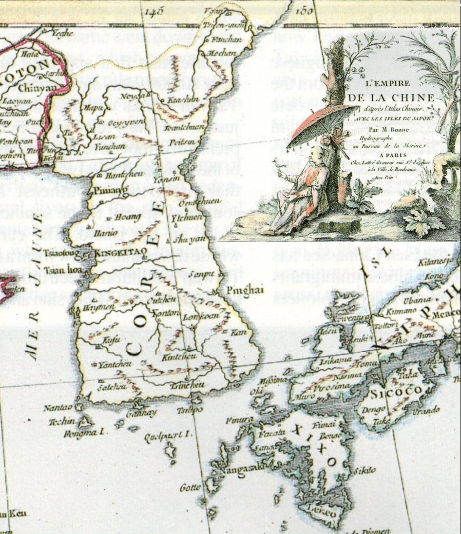 This is also a French map from Korea it's a part of a bigger map, the year of issue unknown.The city names are transcribed from Chinese. The only real recognizable names are Quelpaert and Chinju is recognizable as "Tsincheu". Nagasaki is written as Nangasaki, just as Hamel does! Fungma is the Chinese name for Cheju-do. Obviously one though that there were two islands ! (In the Dutch resources you can see the explanation as how this was possible (provided that you read 17th century Dutch